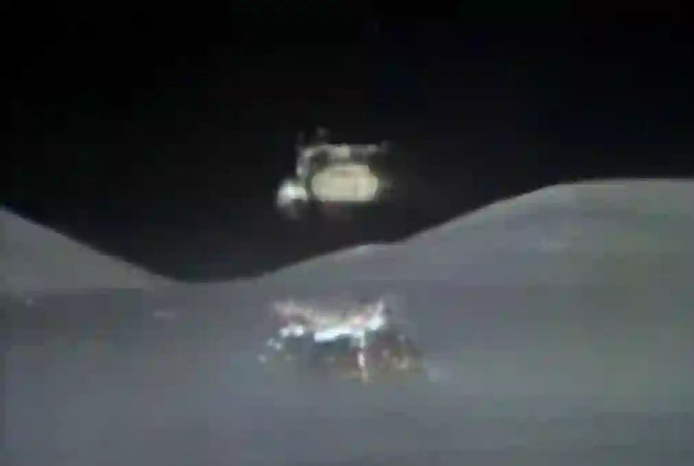 另外阿波罗 16~17 号月球漫游车上的摄像机,也拍摄到了珍贵的登月舱上升级离开月球画面。下图为阿波罗 17 号两名宇航员离开月球的刹那,这是阿波罗计划的最后一章。