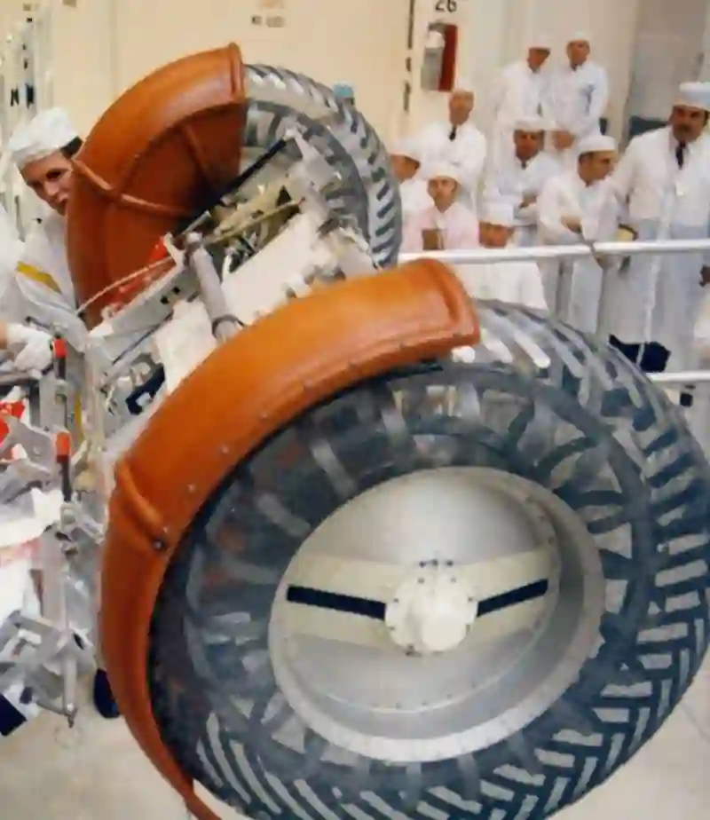 最大的挑战,来自减重,前期马歇尔太空中心通过大量的论证,固特异充气橡胶胎(不耐高温)、格鲁曼的金属扫把轮、风火轮、Bendix 的弹力圈圈轮(太重)都不及通用汽车的金属丝编织轮胎,现在进入「量产」阶段了。