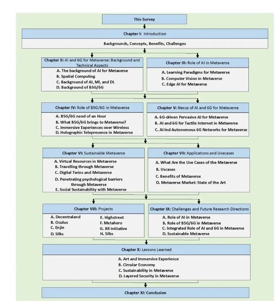 从上述讨论可以清楚地看出,现有的一些调研集中在AI、6G和相关技术的非常狭隘的视角,而其他一些调研了元宇宙在社会、经济和数字价值方面的作用。与之相反,在本综述中,我们提供了以下关键贡献: