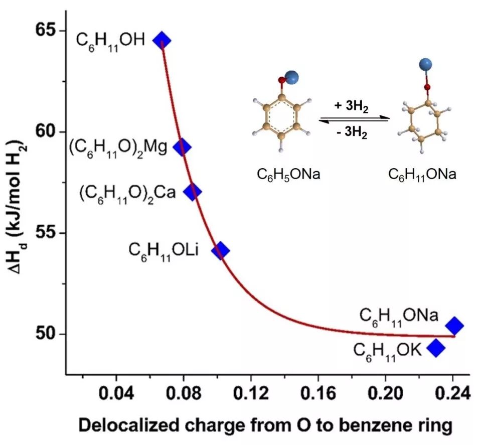 近期,该团队提出一种全新的策略:利用金属的电负性差异,修饰有机储氢材料的电子性质,合成出了一类新颖的有机-无机杂化储氢体系——金属有机化合物。理论计算表明,增加有机碳环中的电子密度,可以显著降低有机物的脱氢焓变,且电子密度越高,脱氢焓变越低,科研人员利用具有较强供电子性质的碱金属或碱土金属改性有机储氢材料,发现其环中电子密度明显增加,从而有效地降低了有机材料的脱氢焓变;同时理论计算还表明,随着金属的供电子性质增强,材料的脱氢焓变越低,即通过选择不同的金属,可以可控地调变材料的脱氢焓变,从而在热力学上控制材料的脱氢温度。该工作以钠修饰的苯酚-环己醇为例,计算发现其脱氢焓变可以从64.5kJ/mol-H2降低为50.4kJ/mol-H2;此外,随着金属给电子能力增强,环己醇钠α位C-H键键长增加,二者成线性关系,这说明材料经过有机无机杂化后,已经被活化,并且脱氢过程中α位C-H键优先断裂。