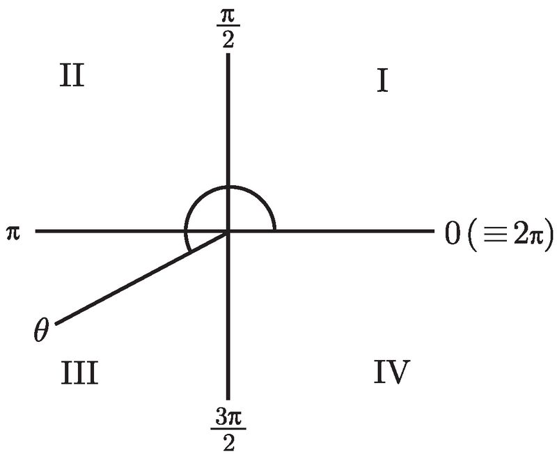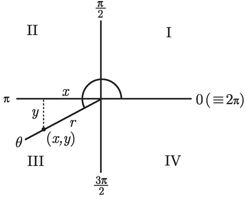 注意到坐标轴将平面分成了四个象限, 标记为Ⅰ到Ⅳ, 且标记的走向为逆时针方向. 这些象限分别被称为第一象限、第二象限、第三象限和第四象限. 下一步是要画一条始于原点的射线 (就是半直线). 那么究竟是哪一条射线呢?这取决于角 θ. 来想象一下, 你自己站在原点上, 面向 x 轴的正半轴. 现在沿着逆时针方向转动角 θ, 然后你沿着一条直线向前走. 你的足迹就是你要找的那条射线了.