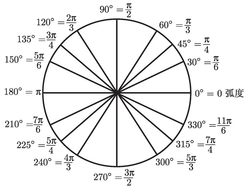 上图表示了一般情况, 但要紧的还是一些常用角的度和弧度表达. 首先, 你应该确实掌握, 90° 和 π/2 弧度是一样的. 类似地, 180° 和 π 弧度是一样的, 270° 和 3π/2 弧度是一样的. 一旦掌握了这几个角, 就试着将图 2-2 中所有的角在度与弧度之间来回转换吧.
