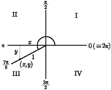 现在来看一个例子. 假设, 我们想求 sin (7π/6). 首先, 7π/6 会在第几象限呢? 我们需要决定 7π/6 会出现在列表 0, π/2, π, 3π/2, 2π 的哪个地方. 事实上, 7/6 大于 1 但小于 3/2, 故 7π/6 在 π 和 3π/2 之间. 事实上, 图 2-8 看起来很像前面的例子.