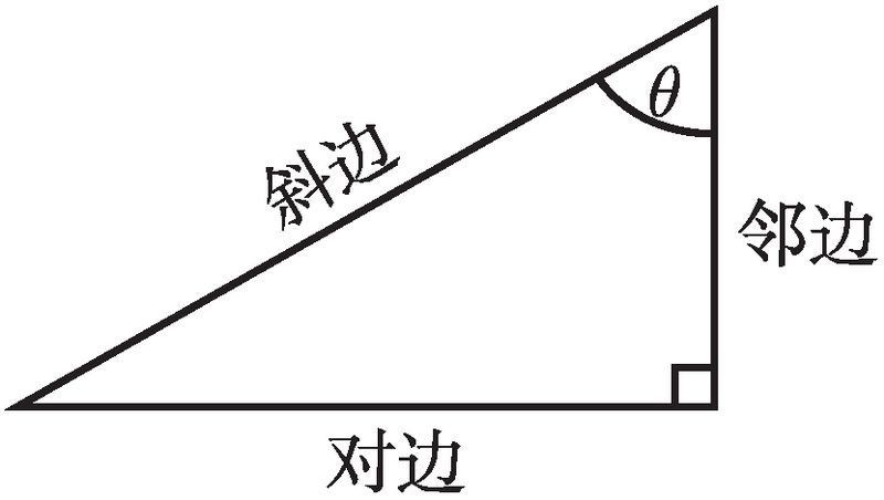 当然, 如果变换了角 θ, 那么也必须变换其对边和邻边, 如图 2-4 所示. 毫不奇怪, 对边就是对着角 θ 的边, 而邻边则是挨着角 θ 的边. 不过, 斜边始终保持不变: 它是最长的那条边, 并始终对着直角.