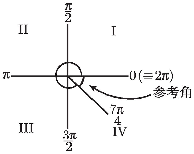 来看一些例子. 如何求 cos (7π/4) 和 tan (9π/13) 呢?我们一个一个地看. 对于 cos (7π/4), 我们注意到 7/4 介于 3/2 和 2 之间, 故该角必在第四象限, 如图 2-11 所示.