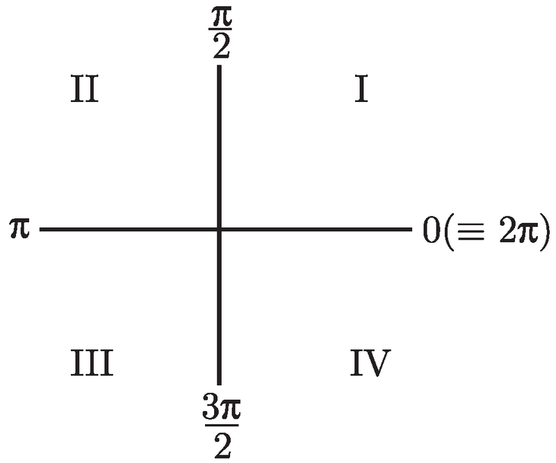 让我们来总结一下这些发现吧. 首先, 所有三个函数在第一象限 (I) 中均为正. 在第二象限 (II) 中, 只有正弦为正, 其他两个函数均为负. 在第三象限 (III) 中, 只有正切为正, 其他两个函数均为负. 最后, 在第四象限 (IV) 中, 只有余弦为正, 其他两个函数均为负. 具体如图 2-10 所示.