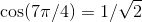 为了求出参考角, 注意到我们必须向上走到 2π (注意! 不是到 0), 因此, 参考角就是 2π 和 7π/4 的差, 即 (2π - 7π/4), 或简化为 π/4. 所以 cos (7π/4) 是正的或负的 cos (π/4). 根据表, cos (π/4) 是 . 但到底是正的还是负的呢?由 ASTC 图可知, 在第四象限中余弦为正, 故结果为正的那个: