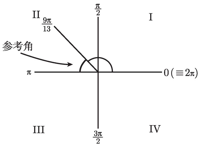 现在来看一下 tan (9π/13). 我们发现 9/13 介于 1/2 和 1 之间, 故角 9π/13 在第二象限, 如图 2-12 所示.