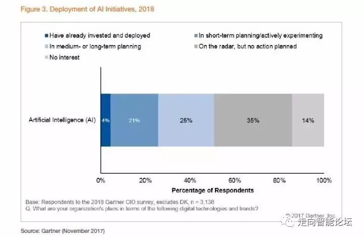 目前的人工智能趋势意味着大多数机构将不必从头开始启动他们自己的人工智能研究项目。相反,CIO们将能够从当前的知识中收集和整理合理的发展战略,集合各业务单位的具体擅长。今天,绝大多数企业处于人工智能倡议的早期阶段,但它们正在迅速地向前发展。来自Gartner的最新调查数据显示,约4%的CIO(首席信息官)有AI部署,另外21%有短期规划,另有25%在中期或长期规划中有AI倡议。