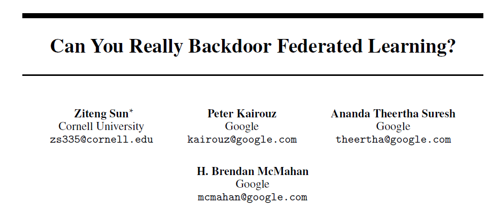 本文是 Google 的一篇关于联邦学习后门攻击问题的文章,其中第一作者来自于 Cornell 大学。文章发表于 NeurIPS 2019。本文重点讨论联邦学习中的后门攻击,目的是降低模型在目标子任务上的性能,同时在联邦学习的主要任务上保持良好的性能。本文的研究也属于定向攻击(Targeted Attacks)和模型攻击(Model Attack)类别。与上一篇文章所讨论的问题不同的是,本文的方法允许非恶意的客户端在目标任务中正确标注样本。