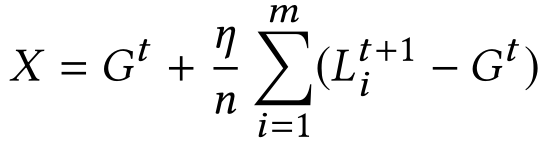 之后,客户端将差值 L^(t+1)-G^t 发送给中央服务器,中央服务器根据收到的信息更新计算全局联合模型: