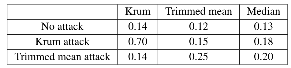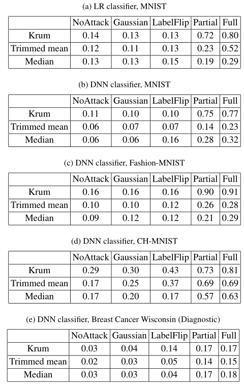 针对未知聚合规则,作者基于某一个聚合规则构建局部模型,之后通过实验验证分析其对其他聚合规则的攻击效果。表 2 显示了聚合规则之间的可转移性,其中也分别考虑了 MNIST 和 LR 分类器。「 Krum 攻击」和 「修整均值攻击」 表示分别基于 Krum 和修整平均聚合规则来构建折衷的局部模型。本实验中考虑部分知识攻击。表中给出的数字结果是测试错误率。