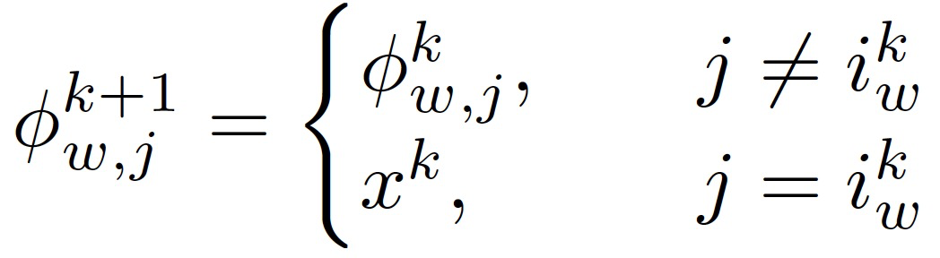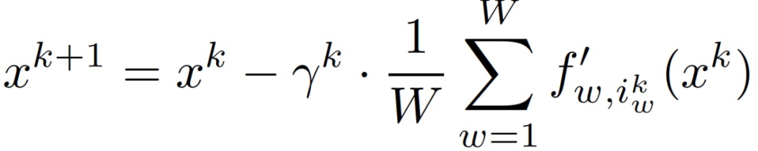 其中,ɸ^(k+1)_(w,j)是指在最近的 k 轮次结束时计算得到最新的 f’_(w,j)值的迭代。具体的,i^k_w 是本地数据样本的索引,即在轮次 k 由工作节点 w 基于数据样本 i^k_w 进行训练。f’_(w,j)(ɸ^k_(w,j))是指在工作节点 w、轮次 k 中,之前存储的第 j 个数据样本的随机梯度,以及可以计算得到: