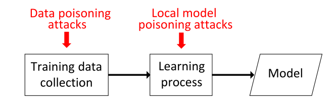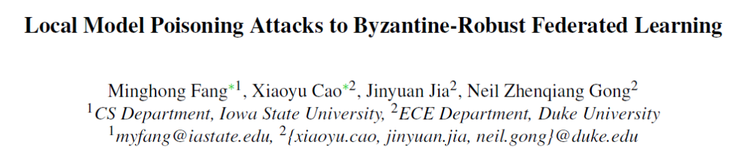 本文是 Duke 大学 Gong Zhenqiang 教授组的一篇文章,发表在 USENIX Security Symposium 2020,重点讨论如何在拜占庭鲁棒的联邦学习方法中制造有效的模型攻击。该研究的具体内容属于模型攻击(Model Attack)类问题。经典的联邦学习数据中毒攻击(Data Poisoning Attacks)主要是通过攻击者破坏受其控制的客户端中的局部 / 本地数据来实现的。这种攻击对于拜占庭鲁棒的联邦学习是无效的。本文是首次针对具有拜占庭鲁棒性的联邦学习进行的局部模型中毒攻击(Local Model Poisoning Attacks)研究,其目标是在训练阶段破坏学习过程的完整性,如图 1 所示。