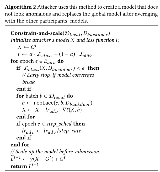 训练并缩放处理(training-and-scale):对于只考虑模型权重大小的异常检测器(例如,欧氏距离),可以用较简单的技术来规避。攻击者训练后门模型直至收敛,然后将模型的权重进行缩放,使之达到异常检测器所允许的边界 S。缩放比例为: