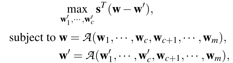 优化问题:攻击者的目标(本文称其为有向偏离目标)是使全局模型参数最大程度地偏离全局模型参数在没有攻击的情况下沿其变化的方向的反方向。假设在迭代中,w_i 是使用第 i 个工作节点设备计划在没有攻击时发送给主设备的局部模型。假定前 c 个工作节点设备受到了破坏。有向偏差目标是通过在每次迭代中解决以下优化问题,为受损的工作节点设备制作局部模型: