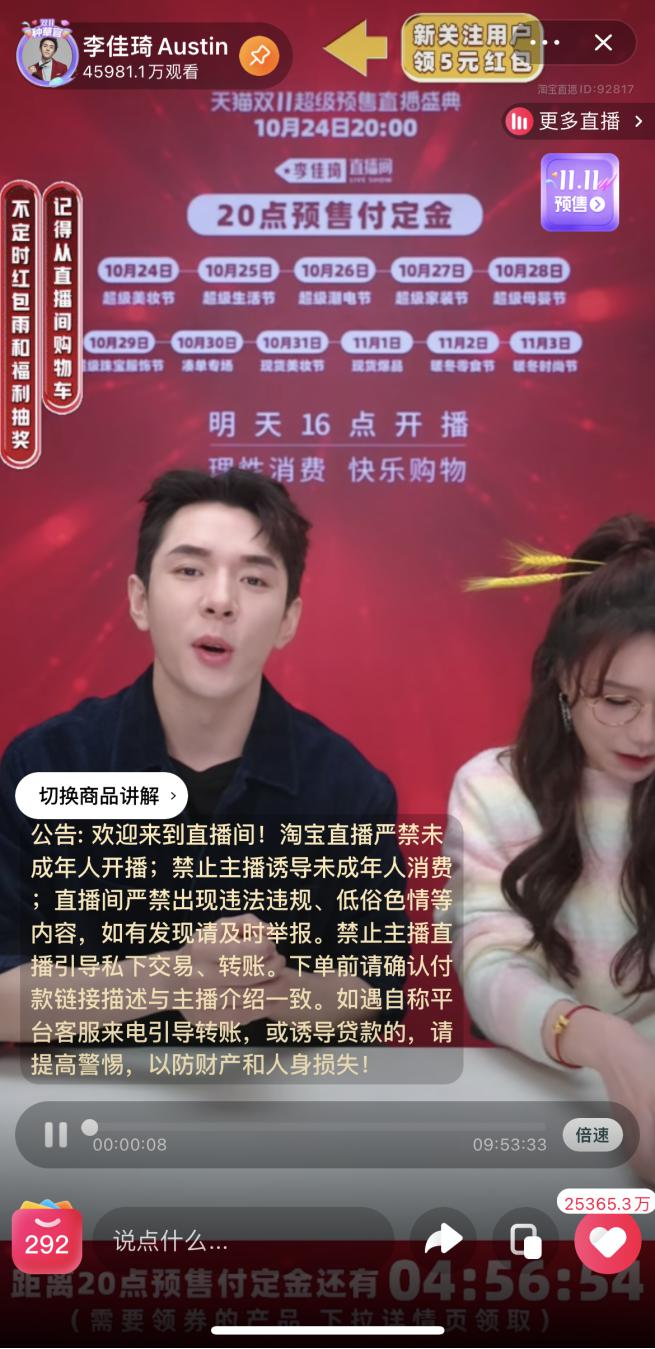 事实上,老罗只是淘宝直播的“开胃菜”,这次双11,淘宝在主播配置上不同以往,类型更广了,受邀的还有10月31日晚将现身淘宝直播的俞敏洪,拥有张柏芝的头部MCN遥望科技,长盛财经主持人姚长盛这样的财经主播等。