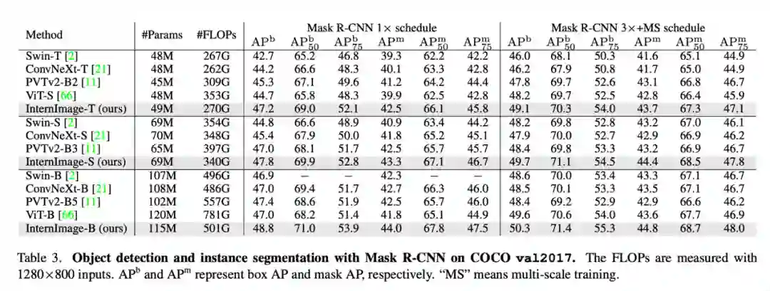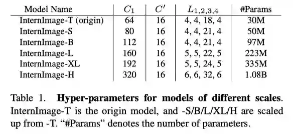 按照此规则,该研究构建了不同尺度的模型,即 InternImage-T、S、B、L、XL。具体参数为: