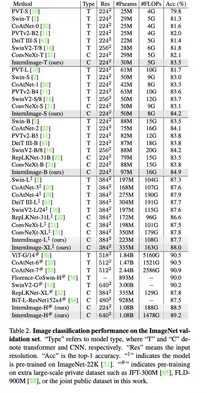 图像分类实验:通过使用 427M 的公共数据集合:Laion-400M,YFCC15M,CC12M,InternImage-H 在 ImageNet-1K 的精度达到了 89.2%。