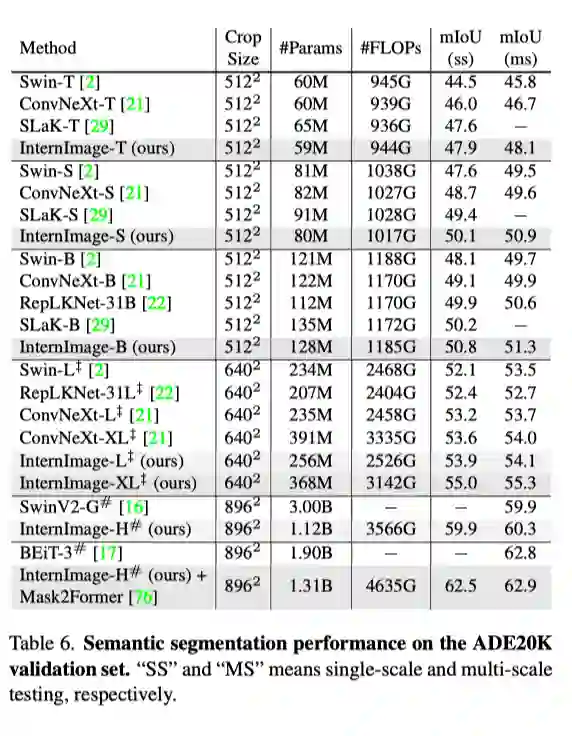 语义分割:在语义分割上,InternImage-H 同样取得了很好的性能,结合 Mask2Former 在 ADE20K 上取得了当前最高的 62.9%。