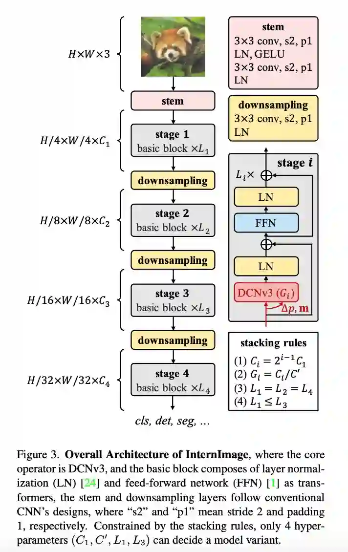 该工作致力于构建一个能够有效地扩展到大规模参数的 CNN 模型。首先,重新设计的可变形卷积算子 DCNv2 以适应长距离依赖和弱化归纳偏置;然后,将调整后的卷积算子与先进组件相结合,建立了基础单元模块;最后,探索并实现模块的堆叠和缩放规则,以建立一个具有大规模参数的基础模型,并且可以从海量数据中学习到强大的表征。