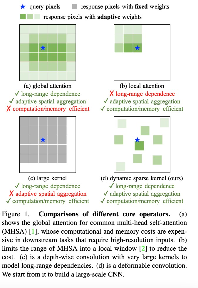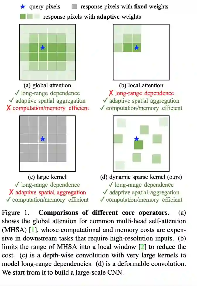 算子层面,该研究首先总结了卷积算子与其他主流算子的主要区别。当前主流的 Transformer 系列模型主要依靠多头自注意力机制实现大模型构建,其算子具有长距离依赖性,足以构建远距离特征间的连接关系,还具有空间的自适应聚合能力以实现构建像素级别的关系。但这种全局的注意力机制其计算和存储需求量巨大,很难实现高效训练和快速收敛。同样的,局部注意力机制缺乏远距离特征依赖。大核密集卷积由于没有空间聚合能力,而难以克服卷积天然的归纳偏置,不利于扩大模型。因此,InternImage 通过设计动态稀疏卷积算子,达到实现全局注意力效果的同时不过多浪费计算和存储资源,实现高效训练。