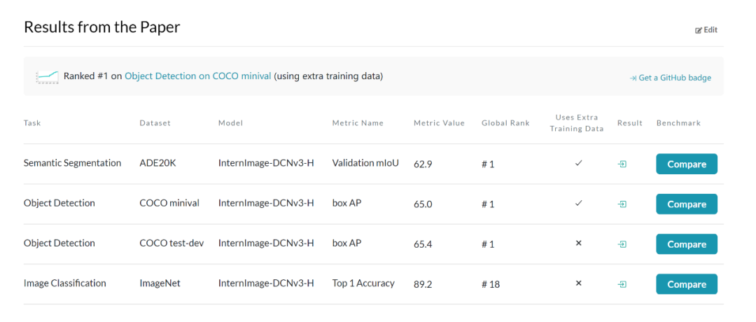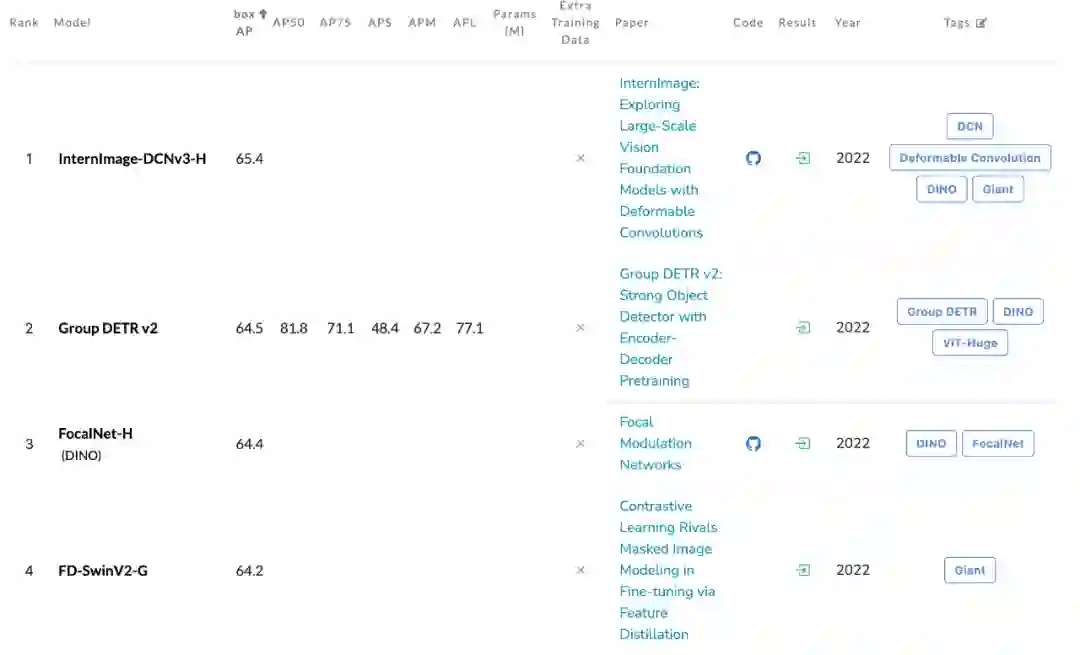 目标检测:以最大规模的 InternImage-H 为骨干网络,并使用 DINO 作为基础检测框架,在 Objects365 数据集上预训练 DINO 检测器,然后在 COCO 上进行微调。该模型在目标检测任务中达到了 65.4% 的最优结果,突破了 COCO 目标检测的性能边界。