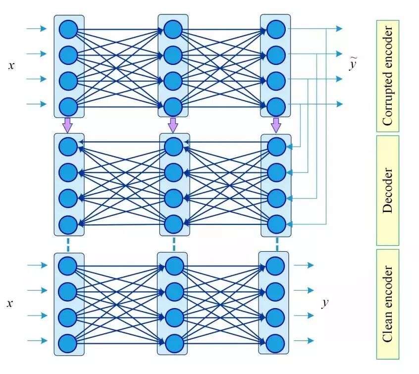 阶梯网络在无监督和半监督学习任务中达到了先进的水平。阶梯网络由两个编码器和一个解码器组成。编码器作为网络的有监督部分,解码器进行无监督学习。训练目标是最小化有监督部分和无监督网络的损失和。