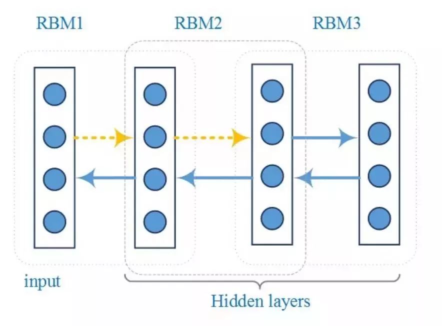 虚线表示特征提取通道,实现表示生成通道。DBN是一种生成神经网络,由一个可见层可几个隐层组成。可以提取训练数据的多层表示,并且对输入数据进行重构。DBN的训练过程是逐层训练,将每一层视作一个RBM,在前一层的基础上进行训练。这样的机制使DBN成为深度学习中有效且快速的网络之一。