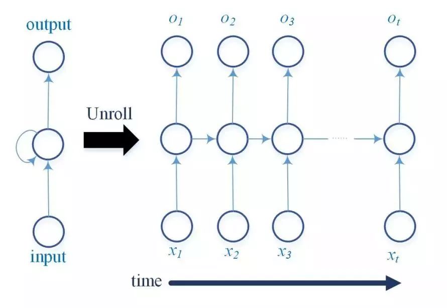 RNN主要适用于输入为序列(例如语音和文本)或时间序列的数据(传感器数据)。RNN的输入既包括当前样例,也包括之前观察的样例。也就是说,时间为t-1时RNN的输出会影响时间为t的输出。RNN的每个神经元都有一个反馈环,将当前的输出作为下一步的输入。该结构可以解释为RNN的每个神经元都有一个内部存储,保留了用之前输入进行计算得到的信息。