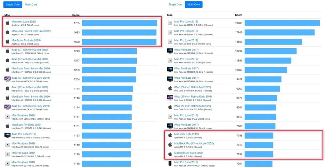 你可以在网上找到 M1 芯片的各种跑分测试,Geekbench[12] 单核跑分已经超过了迄今为止的所有 Mac,多核跑分也超过了去年的 16 寸 MacBook Pro 顶配,仅比 Mac Pro、iMac Pro 和一些高配型号 iMac 低。即使你不关注跑分,也大概能明白 M1 到底有多快。