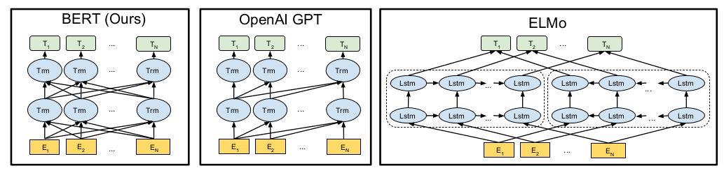 BERT, GPT, ELMo 的模型如下所示: