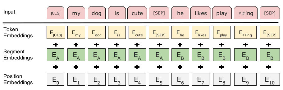 细节上, BERT 使用 [CLS] 这一特殊 token 作为序列的开始, 在后面大有用处, 比如执行文本分类时, 就是以它对应的输出作为序列的表示, 这一传统也被 MT-DNN 沿用了. 和 GPT 类似, BERT 也用了一个分隔符 [SEP] 将两个序列合并成一个序列, 从而将 textual entailment 和 semantic textual similarity 任务转化为文本分类问题 (GPT 只对前一类任务这样做了). 不过 BERT 还为两个序列赋了不同的 embedding, 称为 segment embedding, 所以它的模型输入是 3 项的和: word(token) embedding + position encoding + segment embedding. 如下所示: (显然如果只是一个序列的情况, 只是用一个 segment embedding 即可; 要是丧心病狂到多个序列的合并, 估计得用多个 segment embedding 才行)