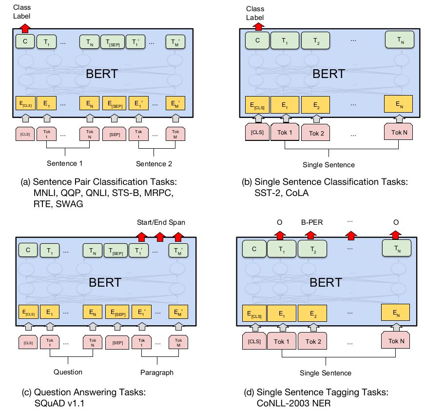 至此, 预训练就讲完了. Fine-tuning 的话, 看下面这张图吧. 图 a, b 分别适用于句子对(两个句子)和一个文本的情况; 图 d 是一一映射的情况, 适用于 NER, POS Tagging 等任务; 图 c 比较特别一点, 适用于从内容中找答案的 QA 任务 (至少图中所示的方式不适用于开放式任务), 也就是图中的 SQuAD, 对 paragraph 的每一位输出, 都计算它属于答案的概率.