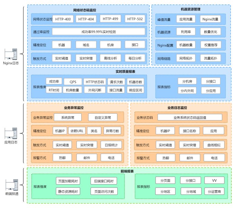 利用Nginx日志、应用异常日志、应用访问、前端投递日志进行如上不同维度的分析,实现了固定阈值、实时突增等触发方式,热聊、邮件、电话等推送方式。