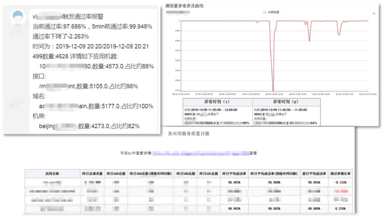 Nginx日志:可获取网络层信息,如:接口、机房、HTTP状态码、域名、IP、RT时间等,我们对这些信息进行实时聚合、监控、报警后二次分析,进行精细化告警,提供排查方向,极大提高排查效率。例如下图中,通过报警截图可知单台机器499状态码占比过高,引起成功率降低,排查方向可确定为这台机器问题,极大提高排查效率。