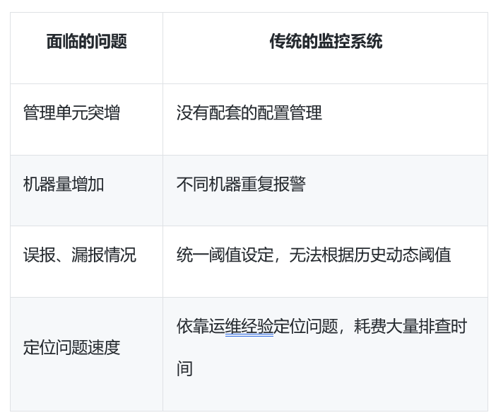 以往监控依赖虚机部署的shell、py脚本,单台虚机异常数目达到阈值,即推送报警,这种方式存在如下问题。