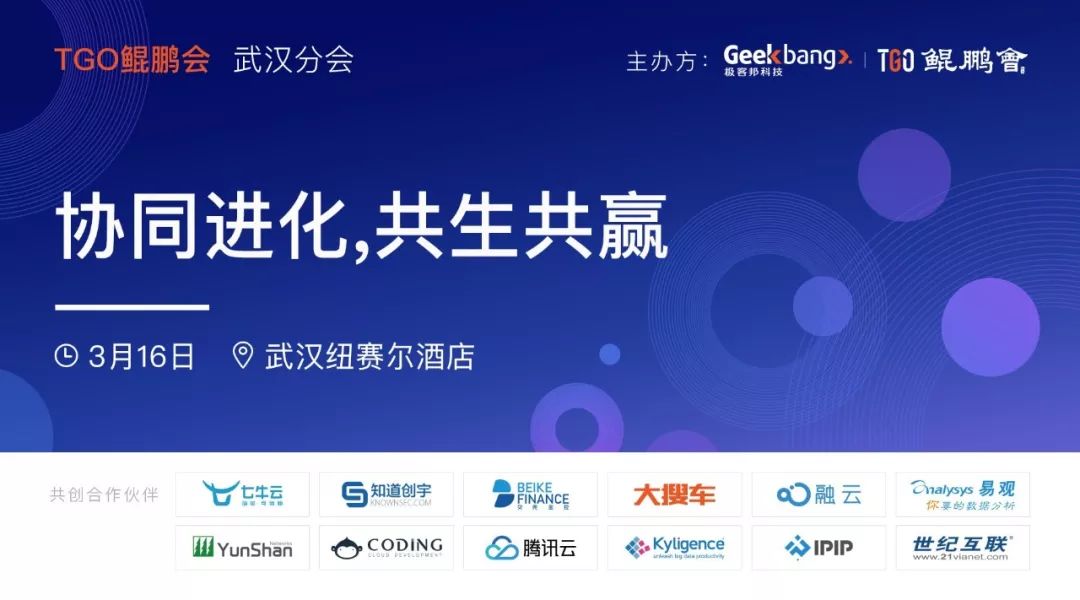 2019 年 3 月 16 日,TGO 鲲鹏会将在武汉举办分会成立仪式,为武汉的科技圈、科技领导者创建更多交流的机会,与大家一起「协同进化,共生共赢」。本次活动有幸邀请到 Keep CTO & TGO 鲲鹏会会员彭跃辉、随行付 CTO & TGO 鲲鹏会会员于振坤、ThoughtWorks 武汉办公室总经理 & TGO 鲲鹏会武汉分会会长万学凡、爱范儿 CTO & TGO 鲲鹏会会员何世友,他们将用自己的实战经验给大家分享关于「Keep 的技术架构和组织架构的演进」、「CTO 如何提升商业思维能力」、「先管理自己、再带领团队:技术领导者的个人成长」、「从小程序生态聊起,Less 时代前瞻」四个主题内容分享。