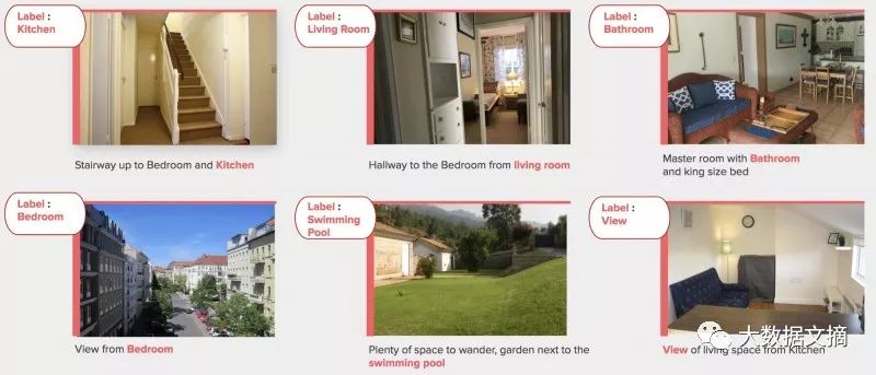 为了权衡成本和性能,我们采取一种混合的方案,一方面,委托第三方对少量打标签,通常是成千上万张照片。以这些具有标签的数据作为模型的评估标准,采用随机抽样法来建立这一标准,以确保标准数据的平衡性;另一方面,利用房东上传的照片标题数据作为房屋类型信息的代表,并从中提取标签。