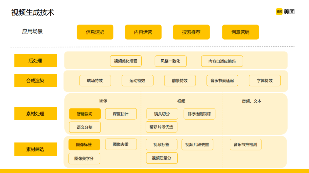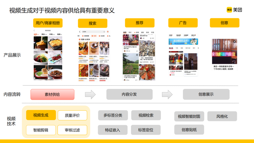 按照视频行业的大致划分,美团的视频绝大多数属于本地生活场景的碎片消费,这其实也是符合大家的认知的。美团的业务场景非常多,不管是在B端还是C端,丰富的供给源和展位都有非常多短视频内容的呈现。在这样的背景下,可以看到美团不仅有丰富的应用场景,同时又有丰富的视频内容和展位。对应到线上的这些应用,往下技术层要做的事情也就逐渐浮出水面,它是一个从视频内容的素材供给到内容分发以及创意展示全链条的一个AI赋能的情况,同时也可以看到在每一个内容流转的环节都有很多计算机视觉技术可以去发挥作用。