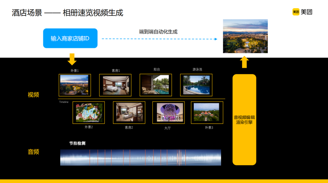 相比于餐饮场景,酒店场景多了一些酒店住宿行业的特色,业务上对于信息内容的呈现有类似于行业脚本这种比较好的呈现顺序,同时这个场景下对于视频和音频相关的配合也有比较高的要求,AI会增量做一些音频节拍的检测辅助人工进行一个卡点,最终呈现出一个观感和体验更加好的相册速览的效果,用户也能很方便地获取各个维度的信息。