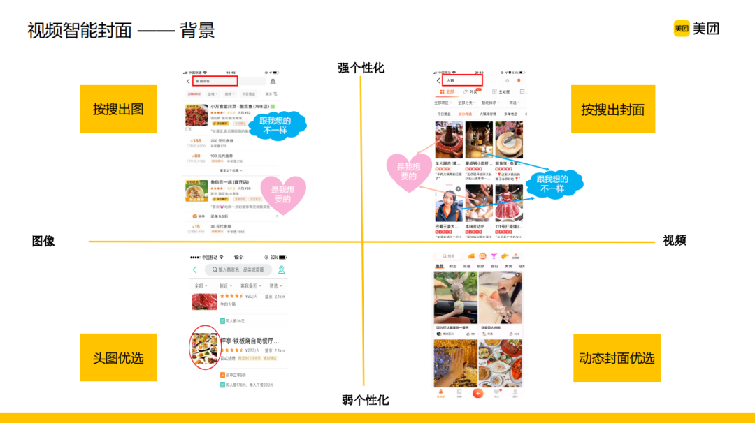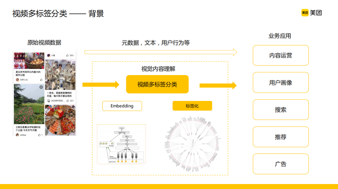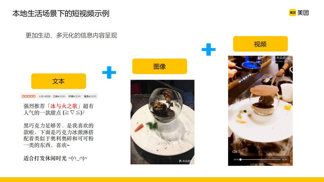 在美团的业务场景下,为什么要对视频数据进行利用和分析?以常见的用户点评为例,传统的文本加图像在呈现信息的时候会有一些不足,相比之下,如果以视频点评的形式去呈现一个非常有创意的内容,不仅对商家来说是一个比较好的信息的宣传,对于用户来说,也是一个更加生动的信息获取的维度。在这种情况下,相信大家可以感受到美团在短视频上其实是大有可为的。