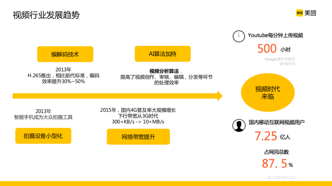 近年来,不管是从技术还是从日常生活,都能感受到我们正在进入到一个视频爆发的年代,当然这背后的一些软件和硬件的技术成为了这件事情的一个助推。从这些统计数据可以看到,无论是内容还是用户维度,视频数据都包含了非常大的信息量。在视频数据的分析过程中,不管是视频的创作、审核、编辑还是分发,AI算法都大有可为。这是视频行业整体现状的一个背景。
