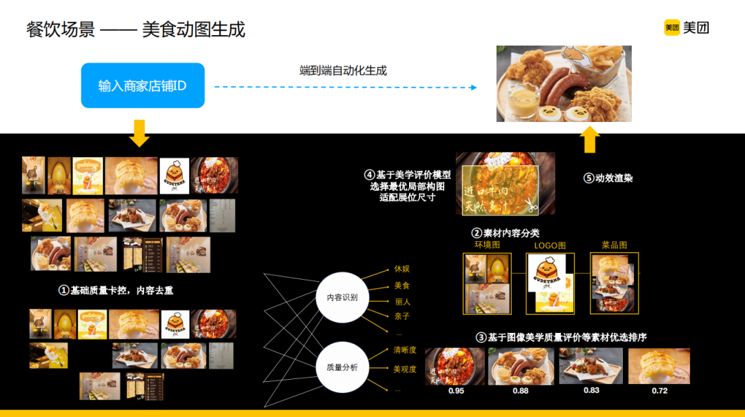 在餐饮场景下,我们需要为商家生成一些宣传的小视频或者动图,这对于商家或者运营侧来说是一个端到端的黑盒,只要输入商家的店铺ID就能自动化生成最终的一个呈现结果。这里我们技术上图像会进行很多素材的AI理解和处理:首先基于识别质量卡控、内容去重对商家的相册进行一个整体的结构化以及质量的排序;然后通过理解内容找出来一些需要的图像并基于图像美学质量评价进行素材的精排;最后进行智能裁切、局部优选、动效渲染来整合素材生成最终的展示视频。在这个自动化的处理流程中,AI技术扮演了重要的角色,比如在素材理解上对菜品的识别和理解能力是比较核心也是很有美团特色的,同时还有素材的智能裁切,这其实都依赖于我们在信息流场景下一些长期的实践积累。
