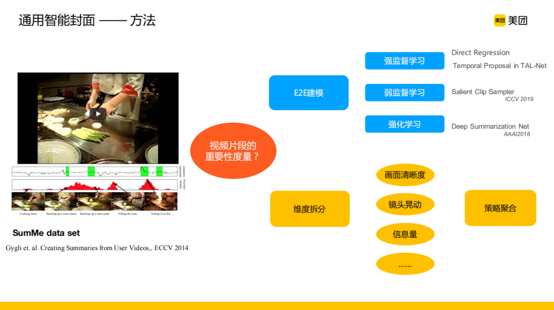 通用智能封面最核心的部分是视频片段的重要性度量,我们需要从视频的重要性波形图中抽出重要性最高的片段往前排作为封面。现有的方法主要分为两类,第一类是端到端模型,利用强监督学习、弱监督学习或者强化学习的方式进行建模,比如利用强监督学习直接去回归人工标注的显著性分数或者精彩度评分值。另一类在冷启动阶段更好处理,可解释性也更强,做法是利用重要性度量进行维度的拆分,人工去定义封面的通用质量评价标准,比如画面清晰度、镜头晃动、信息量等维度,然后每一个维度通过底层特征或者传统的图像质量评价(IQA)方法计算评分,最终通过策略或者模型进行各维度评价结果的聚合。如果在业务场景中能够获取到相关监督信号,第一类方法是非常好并且值得尝试的。在前期能力积累中以及考虑模型的可解释性,我们主要采用第二类方法,在迭代一段时间之后,随着样本的积累可以相应转化到第一类方法。
