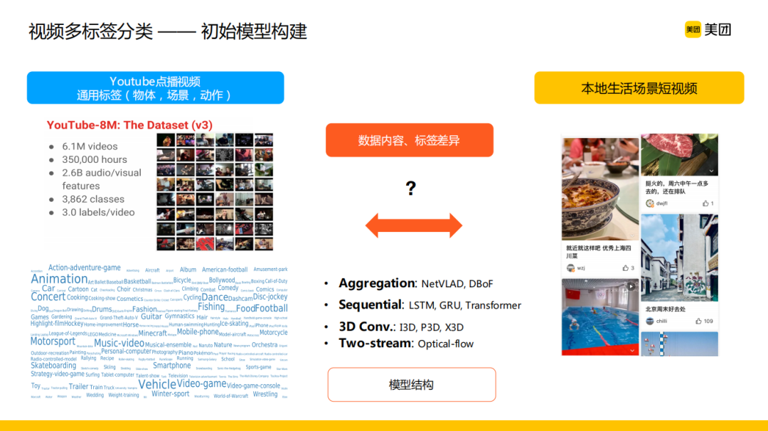 为了快速在业务场景下构建初始的打标能力,最直接的想法就是通过外源数据,利用一些公开的数据集进行知识和标签的迁移。公开数据集中Google的YouTube-8M数据集与多标签分类这个场景最为契合,这个数据集具有非常丰富的实体、场景、动作等各类标签,而且相对通用,具有一定的迁移性,可以应用到我们的业务场景中。模型结构是相对容易处理的一件事情,往年的竞赛中有很多可供参考的模型结构,比如常用的Aggregation、Sequential相关模型。其中,前者逐帧提取特征,然后利用Pooling形成整个视频的表征,后者通过RNN序列建模进行视频特征的抽取。此外,假设提供原始视频的情况下,还有3D Conv、Two-stream这样两类主流的视频分类模型,这些基本涵盖了视频分类中主流的一些方法。结合我们的业务场景,由于我们的视频大多是分钟级或者几十秒甚至十几秒的小视频,时序的长时上下文重要性不那么强。同时我们的业务场景以实体和场景标签为主,运动特征虽然能够提供增量信息,但在前期从零到一构建标签模型的阶段并不是刚需。结合这两点,我们选择了第一类Aggregation模型。
