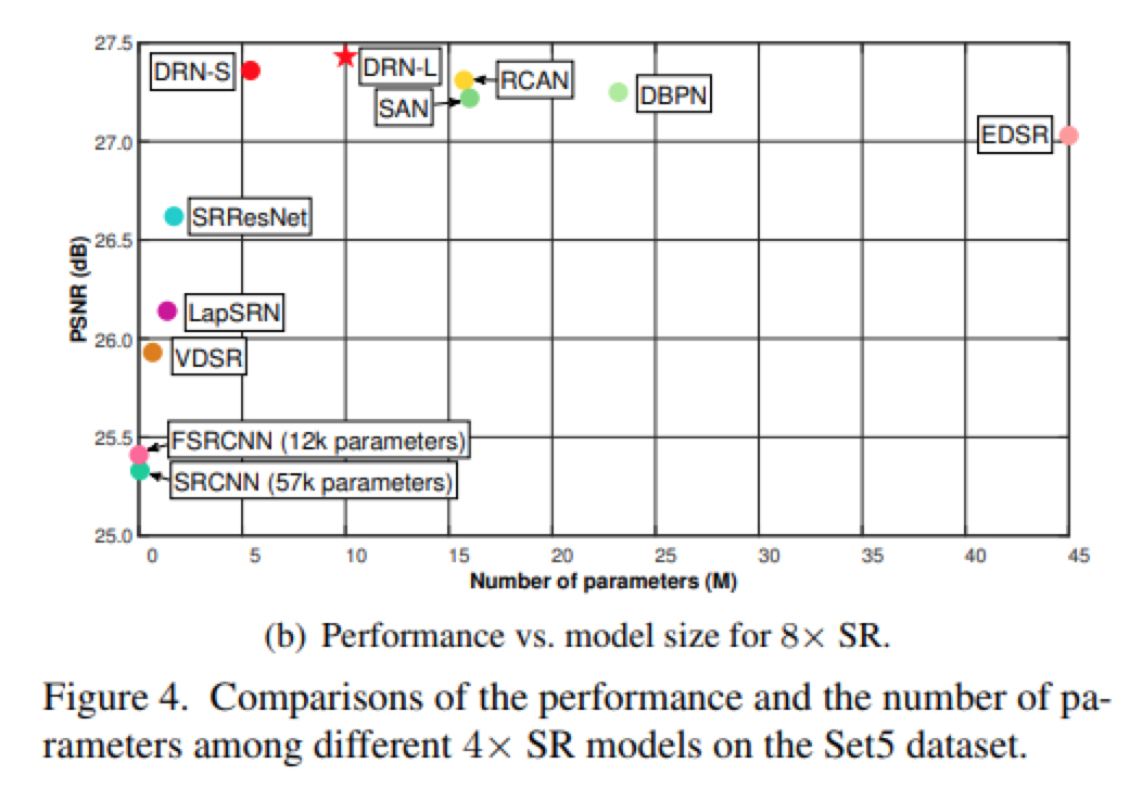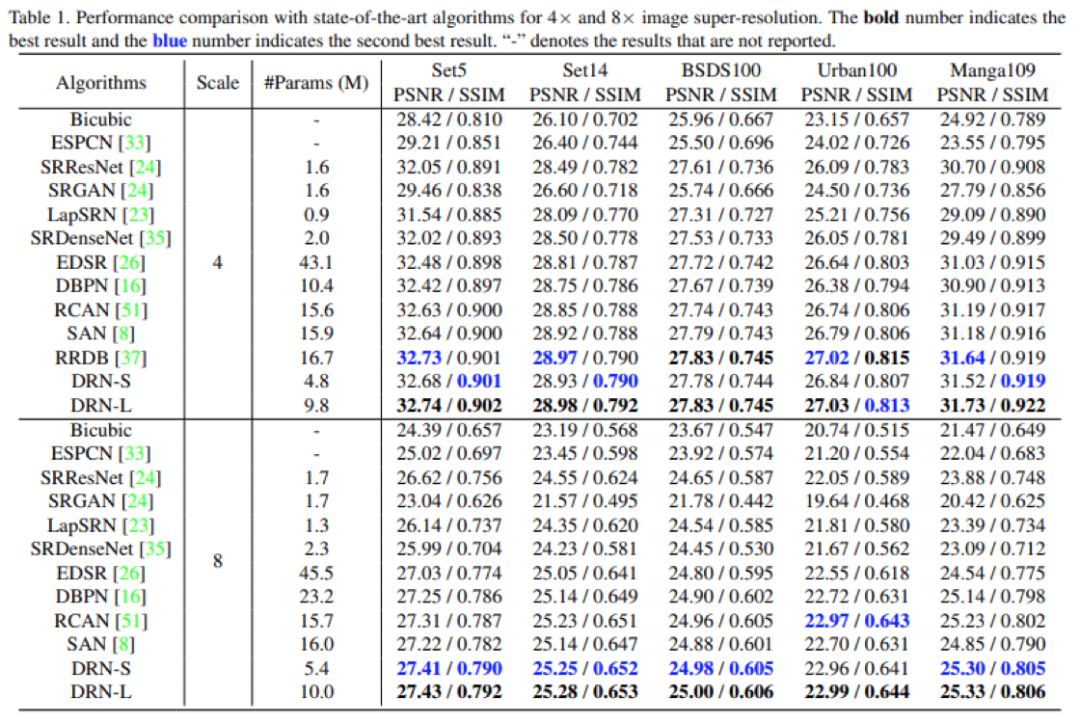 作者首先展示了4x和8x SR的性能和模型大小的比较。在实验中,作者提出了两种模型,即小模型DRN-S和大模型DRN-L。而对比的方法是从它们的预训练模型,开源的代码或是原始论文中获得的结果。结果如下: