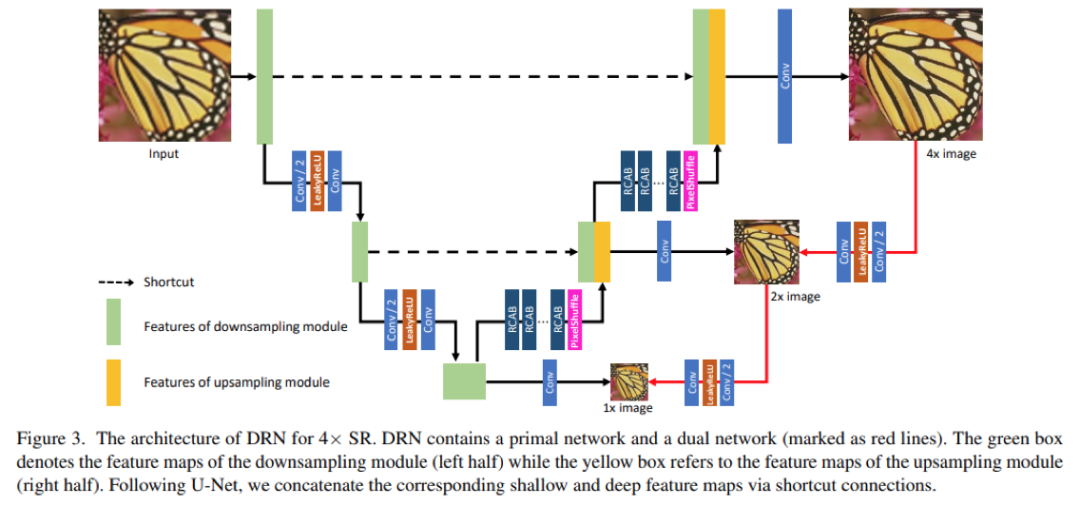 网络的整体结构如下图所示,它是基于U-Net设计的超分辨网络。本文的DRN模型由两部分组成:原始网络和对偶网络。作者还给出了详细的理论证明,这里就不赘述了,详情可以参见论文。