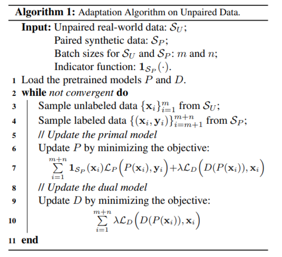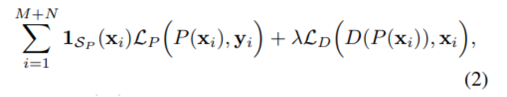 这是一种半监督的学习方法,使用配对的数据训练P网络,使用没有配对的数据训练D网络。目标函数如下,其中当使用有标签的数据时,1Sp为1,当使用没有标签的数据时,1Sp为0。