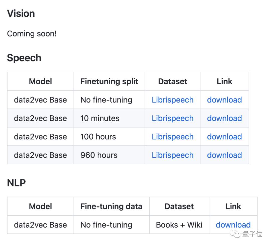这样标准化之后,Data2vec还针对不同的下游任务做了一些微调,其中语音和文本的模型已经在GitHub上放出,视觉模型也正在路上: